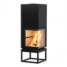 Топка с угловым стеклом придает камину оригинальный вид и увеличивает обзор огня, который хорошо просматривается с двух зон помещения.